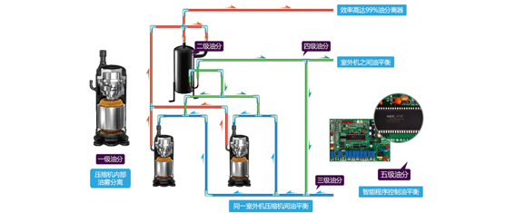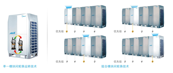 系統(tǒng)根據(jù)系統(tǒng)負荷情況,輪換設置優(yōu)先開啟的室外機模塊的壓縮機順序,平衡分配每臺室外機模塊的運行時間,大大提高了機組的可靠性和使用壽命。