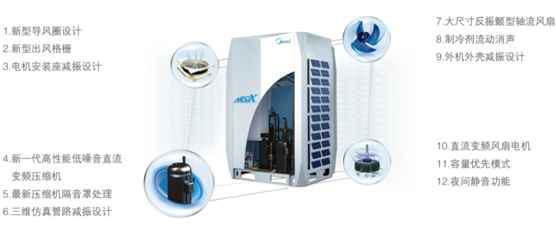 利用CFD、FEM等先進技術對空調系統(tǒng)的元器件振動源進行優(yōu)化,實現(xiàn)靜音運轉,夜間運行模式把噪音降低到最低。